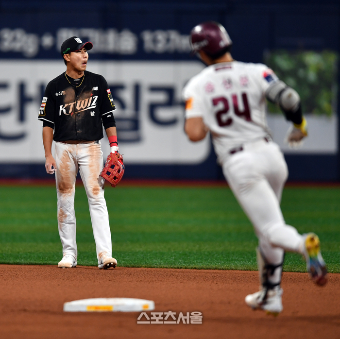 • [포토]‘시선 피하는 심우준’ 8회말 솔로포 송성문