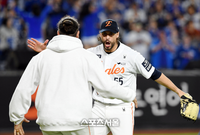 • [포토]한국시리즈 진출의 기쁨을 나누는 한화 와이스와 폰세