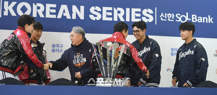 • [포토] 염경엽 - 김경문 감독 ‘멋진 경기 합시다’