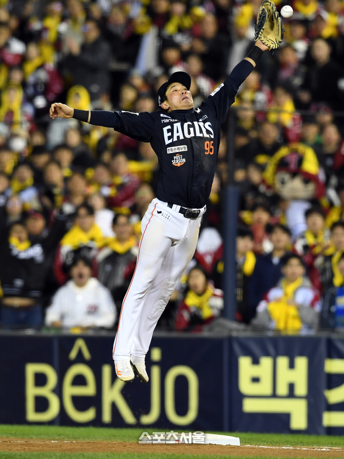 • [포토]한화 황영묵 위로 날아가는 노시환의 송구