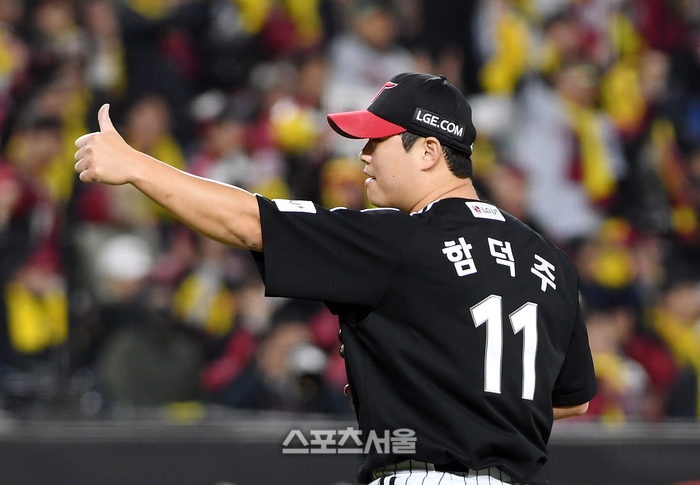 • [포토]박동원을 향해 엄지를 치켜세우는 LG 함덕주