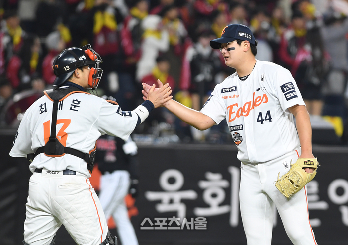 • [포토]승리의 하이파이브를 나누는 한화 김서현과 최재훈