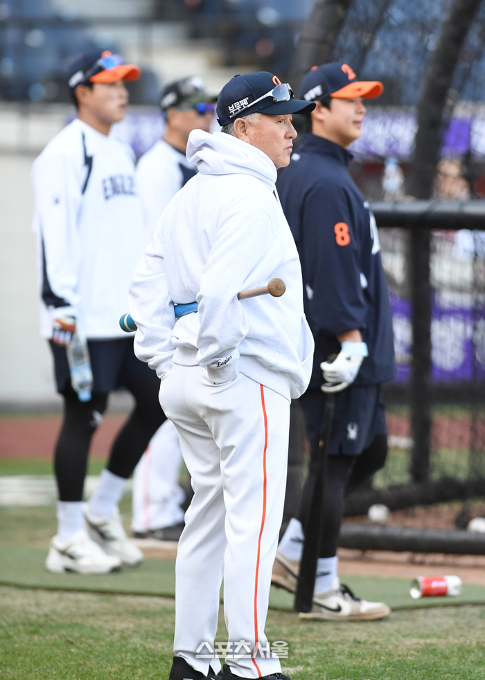 • [포토]KS 5차전 준비하는 한화 김경문 감독