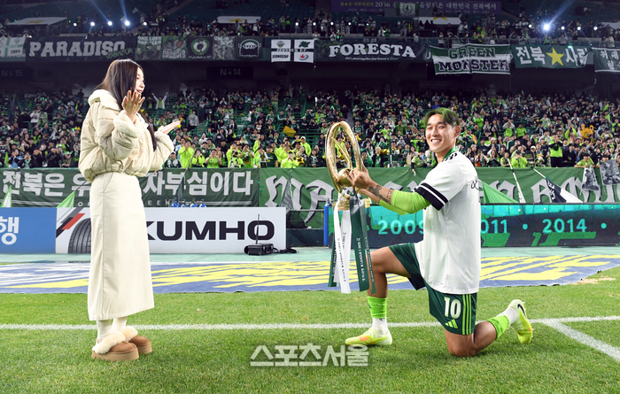 • [포토]전북 송민규, 결혼 약속 곽민선 아나운서에게 우승 트로피를!
