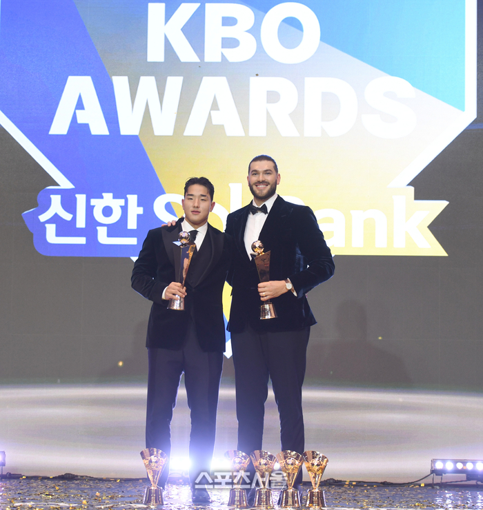 • [포토] 안현민-폰세 ‘신인상-MVP 트로피 들고’