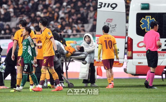 • [포토]퇴장당한 전북 이승우와 구급차에 실리는 광주 권성윤