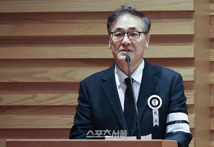 • [포토]故 안성기 영결식, 추도사 하는 배장호 감