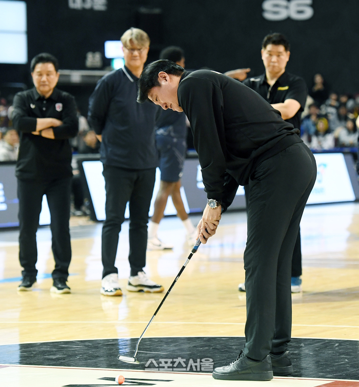 • [포토]농구 코트 위에서 골프 퍼팅하는 문경은 감독