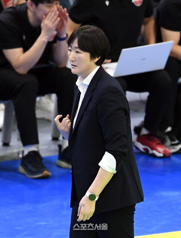 • [포토]페퍼저축은행 장소연 감독, 서브는 여기!