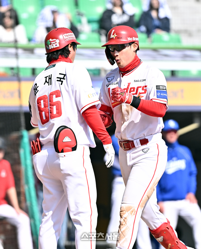 • [포토]2점 홈런의 기쁨을 나누는 SSG 최지훈