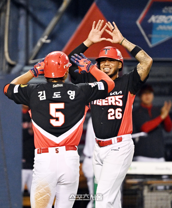 • [포토]카스트로와 홈런 하이파이브 나누는 KIA 김도영