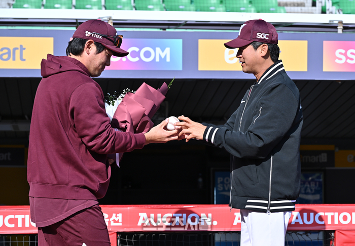 • [포토]설종진 감독의 데뷔 첫 승을 축하하는 키움 주장 임지열