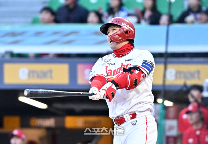 • [포토]류현진 상대 역전 홈런 넘기는 SSG 최정