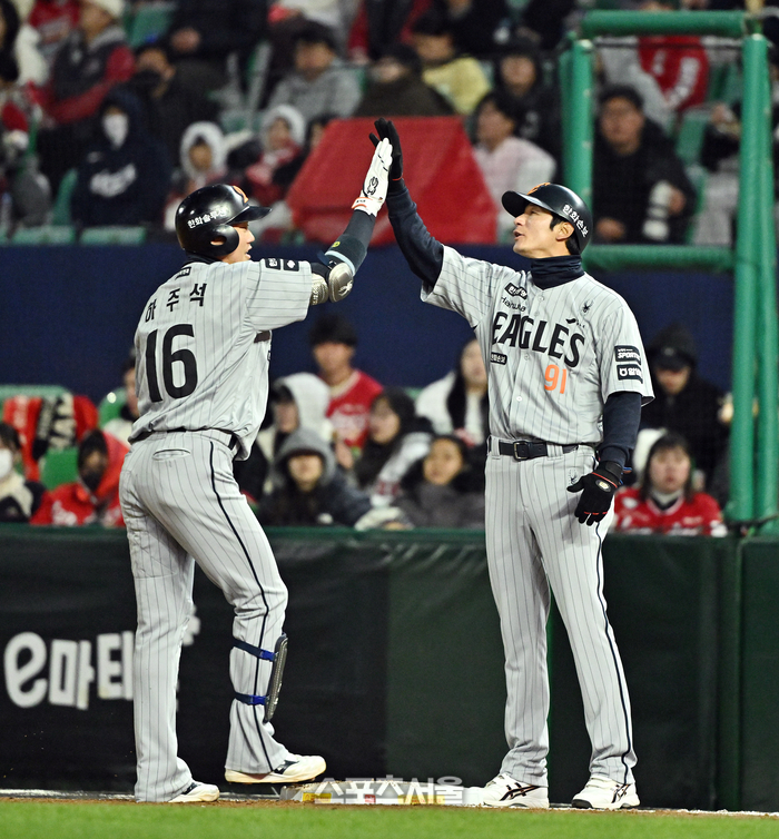 • [포토]역전타에 하이파이브 나누는 한화 하주석