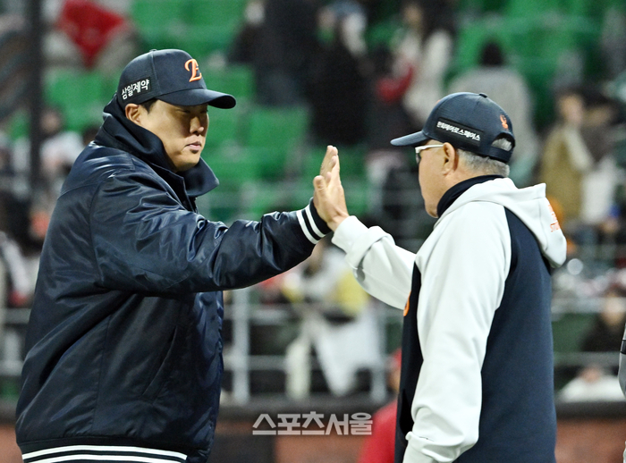 • [포토]김경문 감독과 하이파이브를 나누는 류현진
