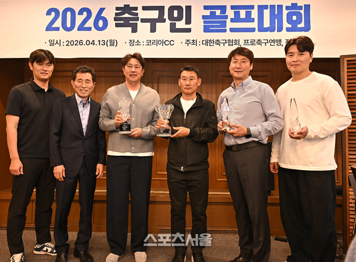 • [포토] 기념촬영하는 축구인 골프대회 수상자들