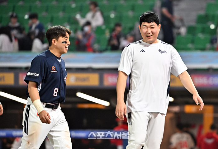 • [포토]승리에 환하게 웃는 두산 손아섭과 양의지