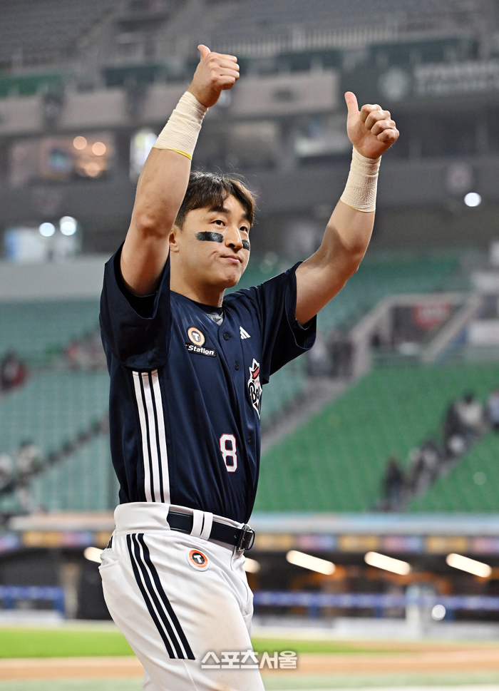 • [포토]트레이드 첫 경기부터 홈런 두산 손아섭, 팬들을 향해!