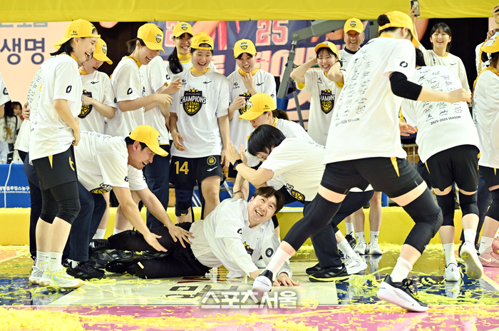 • [포토]KB스타즈 김완수 감독, 선수들의 거친 손길에...
